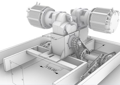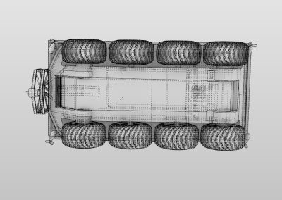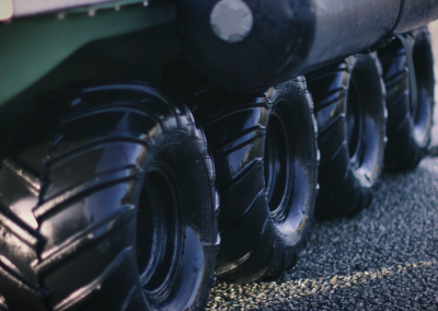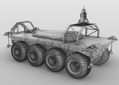 On land, Argonaut features an 8×8 wheel drive system with high-torque motors and a robust gearbox, capable of climbing inclines up to 45 degrees. It reaches speeds of up to 16 mph (at 6000 RPM), with a standard cruising speed of 8 mph (at 3000 RPM). In water, the vehicle achieves 4.5 mph using dual 48V Torqeedo Cruise 4.0 electric motors, offering shallow draft performance ideal for confined or transitional environments.